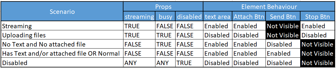 | streaming | If true, will render Abort button otherwise Send button | - |